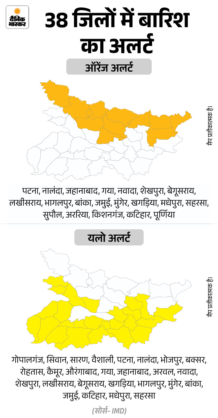 बिहार के 38 जिलों में बारिश का अलर्ट है। मौसम विभाग ने आज 12 में ऑरेंज और 26 जिलों में यलो अलर्ट जारी किया है।